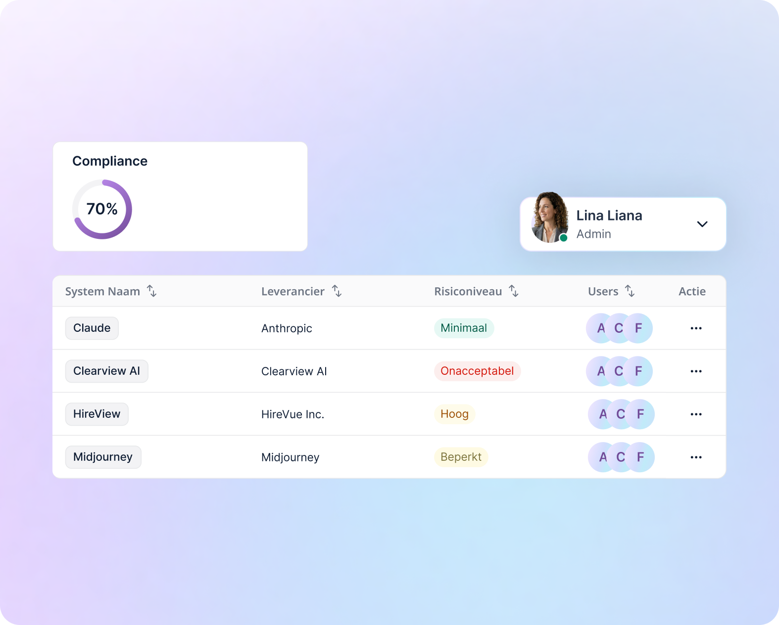 ISO 42001 vraagt dat je niet alleen je eigen AI-systemen beheert, maar ook de risico's van leveranciers die AI inzetten in producten of diensten die jij afneemt. Dat maakt vendor management een blinde vlek voor veel organisaties. Complai brengt eigen systemen én leveranciersrisico's in kaart en koppelt ze automatisch aan de juiste verantwoordelijken.