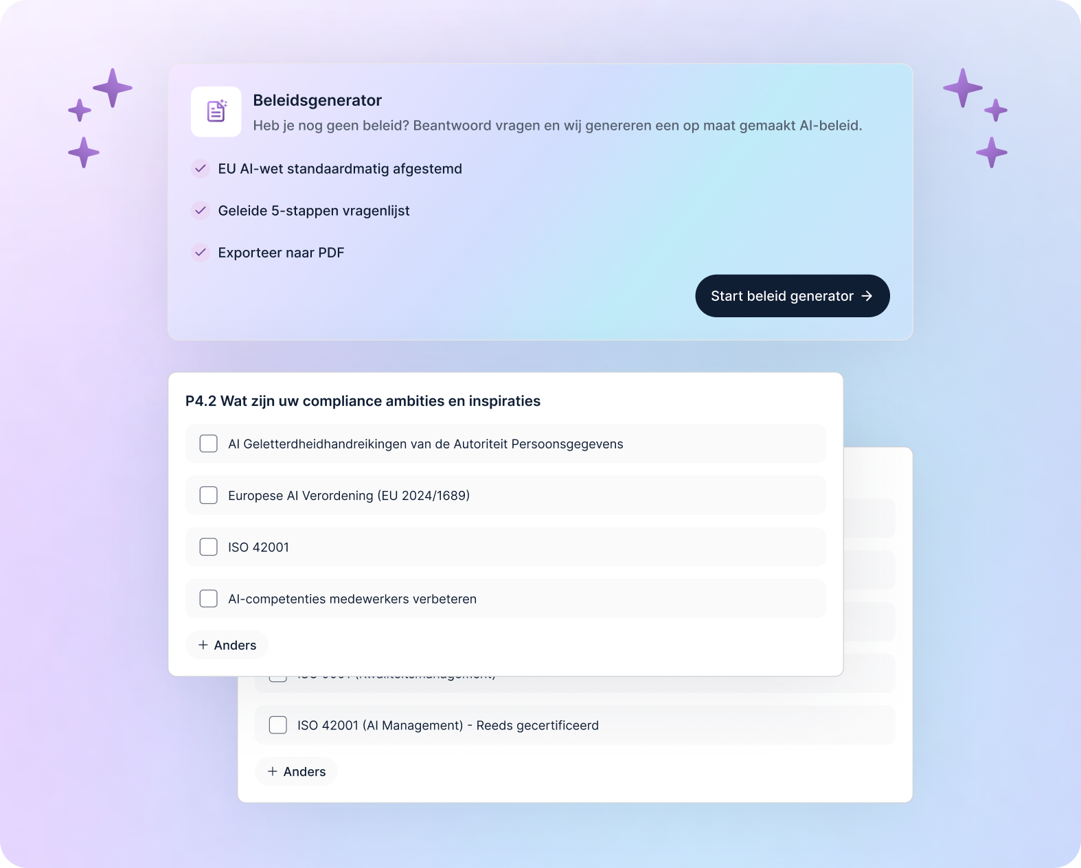 ISO 42001 verplicht je een AIMS in te richten: een systeem van beleid, rollen en processen dat borgt dat AI verantwoord wordt gebruikt. Zonder structuur is dat een tijdrovend traject. Complai genereert werkbare beleidstemplates op basis van jouw organisatiecontext en begeleidt je stap voor stap door de vereisten.
