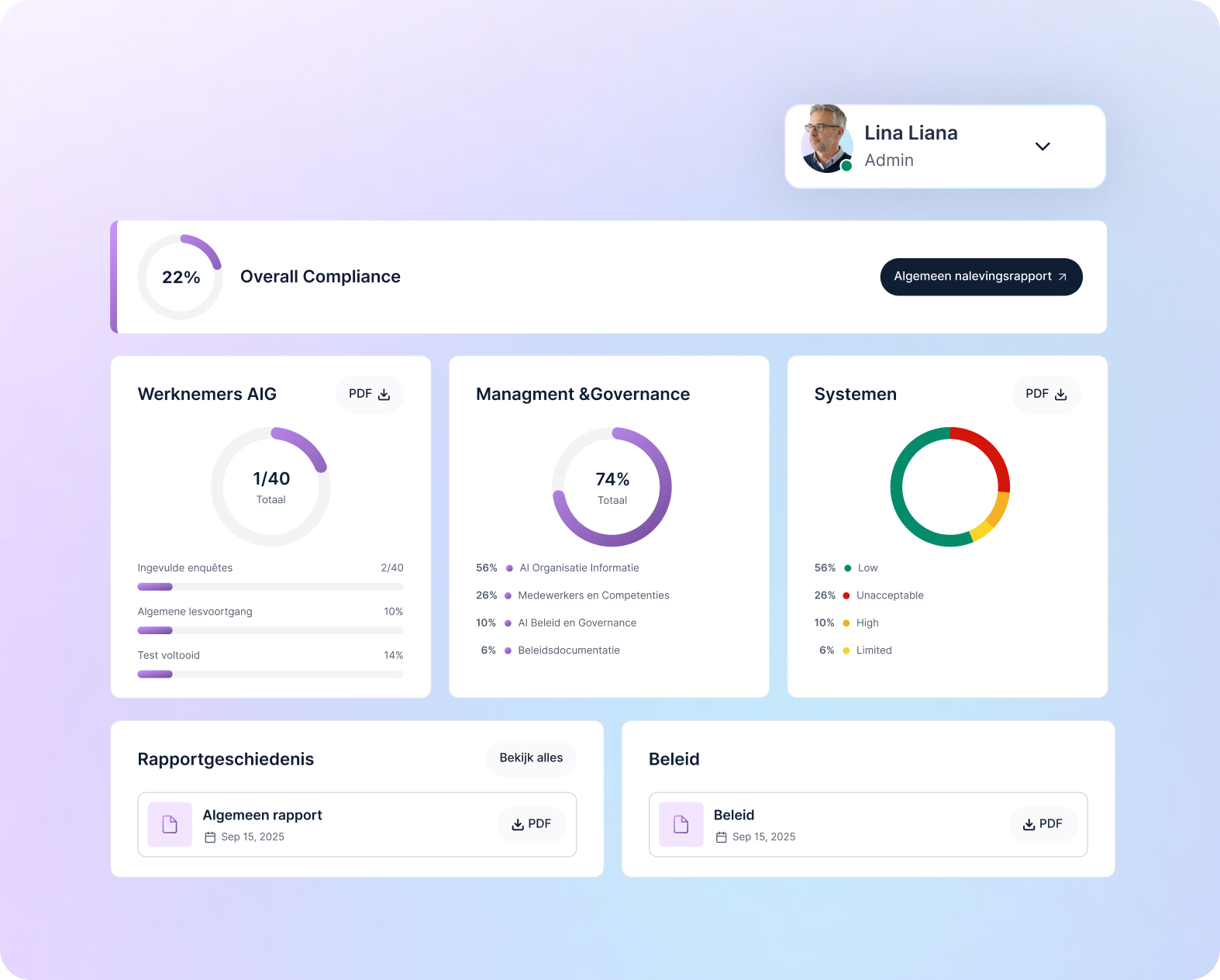 - Management door het ondersteunen van compliance via een vraag-en-antwoorddialoog, waarbij alle relevante onderwerpen (zoals beschreven in de AI-verordening en de AI-geletterdheidsrichtlijnen) worden behandeld.